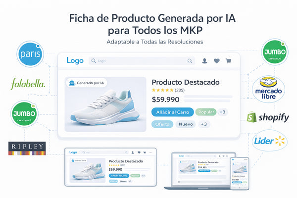 En todas las resoluciones, fondo blanco, tiulos, descripciones, tags con exportacion a cada MKP y Shopify